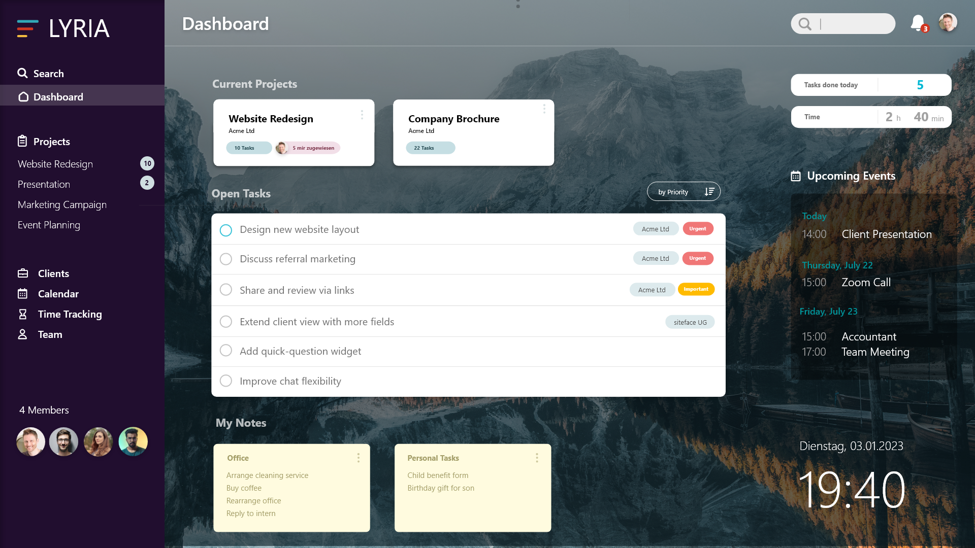 Lyria has helped me better organize my projects and improve communication with my team. We can work on tasks and projects remotely, discuss tasks and solve any open questions without having to meet in person. This saves us a lot of time and allows us to focus on what's important.
